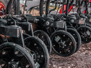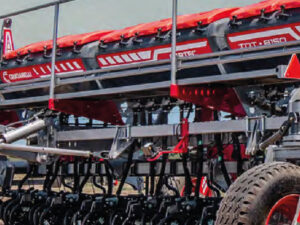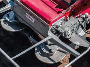 Sistema de distribución de alta eficiencia ideal para aplicación precisa de fertilizantes. Compuesto por doble disco de 600 mm de diámetro, la capacidad de regular tanto el punto de caída de fertilizantes como el ángulo de ataque de las aletas, permite ajustar la distribución según las características físicas del material.